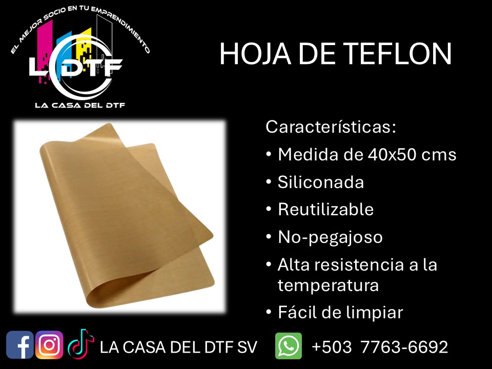 La Hoja de Teflón es un accesorio esencial en procesos de sublimación, DTF y transferencias térmicas, diseñado para proteger tanto las superficies de trabajo como los materiales durante el prensado. con Medidas de 40×50 cms. Su recubrimiento antiadherente de alta calidad evita que tintas, adhesivos o residuos se transfieran a la plancha térmica, garantizando un acabado limpio y profesional en cada aplicación.